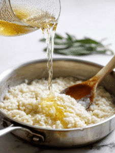 5. Pour in the white wine, stirring continuously until it has nearly evaporated and the rice begins to look glossy.