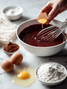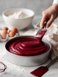 Step 5: Stir in the vibrant red food coloring and vanilla extract. The batter will be thick and vividly red.