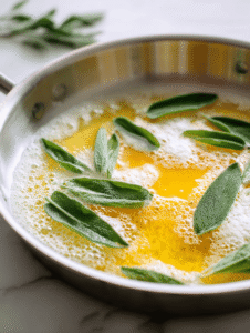 - In a skillet, melt butter over medium heat until it begins to bubble and turn golden. Add fresh sage leaves and cook until fragrant and crispy, about 1-2 minutes.
