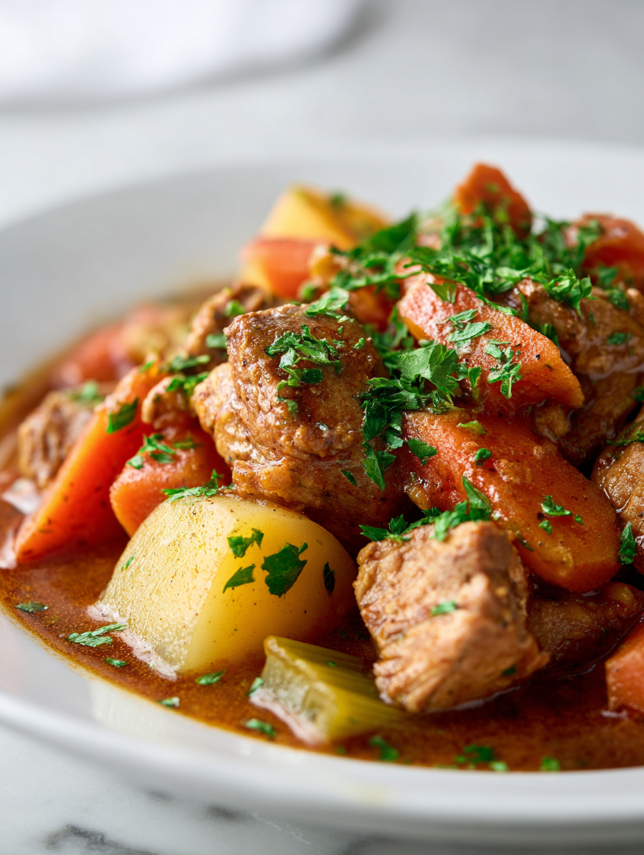 9. Let the stew rest for about 10 minutes to allow the flavors to settle and the sauce to thicken further. Serve the hearty, tender pork and vegetables in bowls, garnished with fresh herbs if desired.
