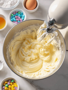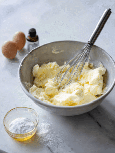 2. In a large mixing bowl, cream together the softened butter and sugar using an electric mixer or whisk until the mixture is light, fluffy, and slightly pale—about 3-4 minutes. You’ll notice a gentle sound of whirling and a creamy texture forming.