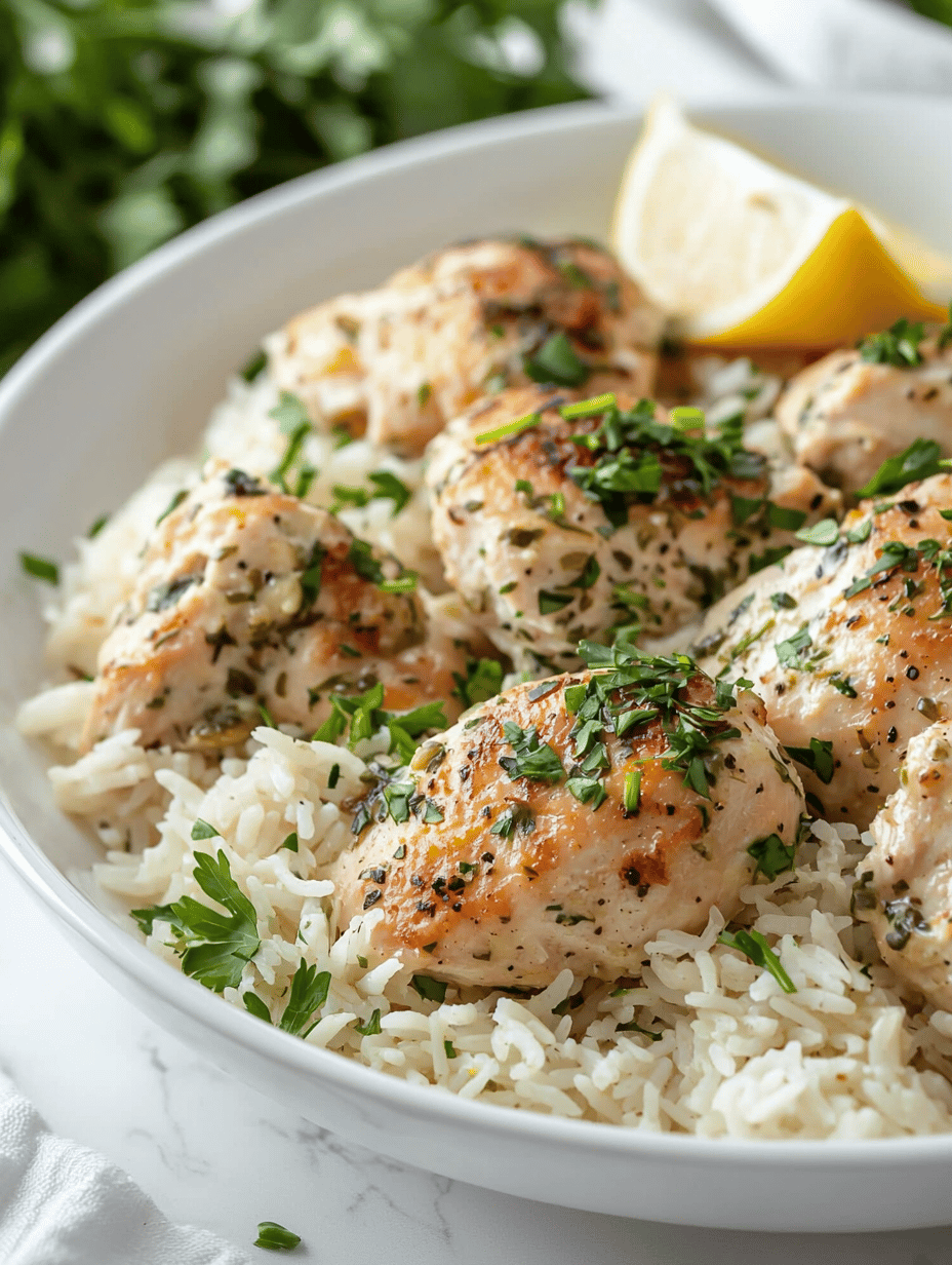- Spoon the herb-enriched creamy chicken generously over the rice, ensuring each serving has plenty of flavorful sauce and tender chicken.