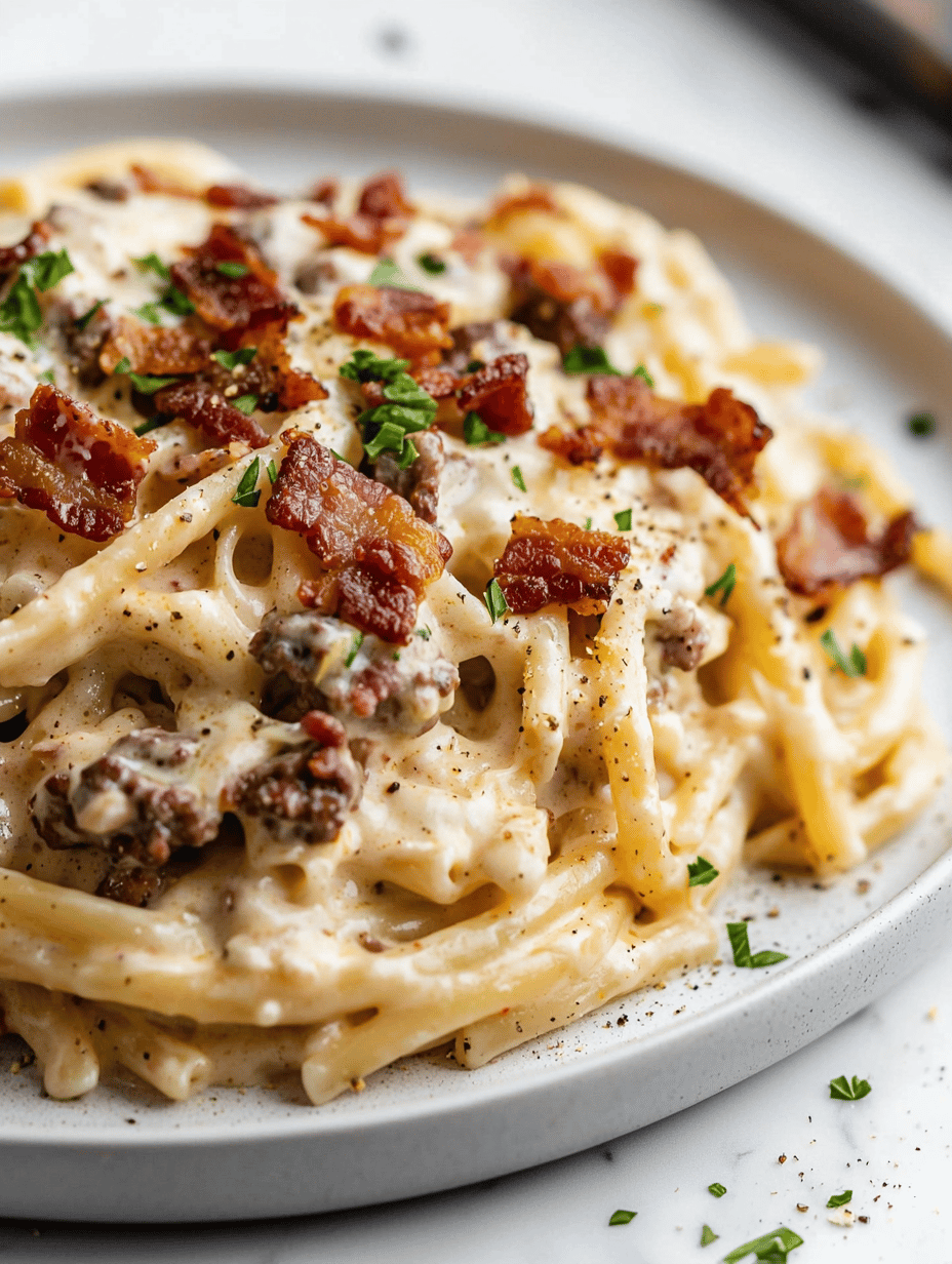 This recipe isn’t just comfort on a plate — it’s a celebration of chaos and cravings. The creamy sauce coats every noodle while crispy bacon and melty cheese add texture and flavor contrasts. It’s perfect for those moments when only something bold will do.