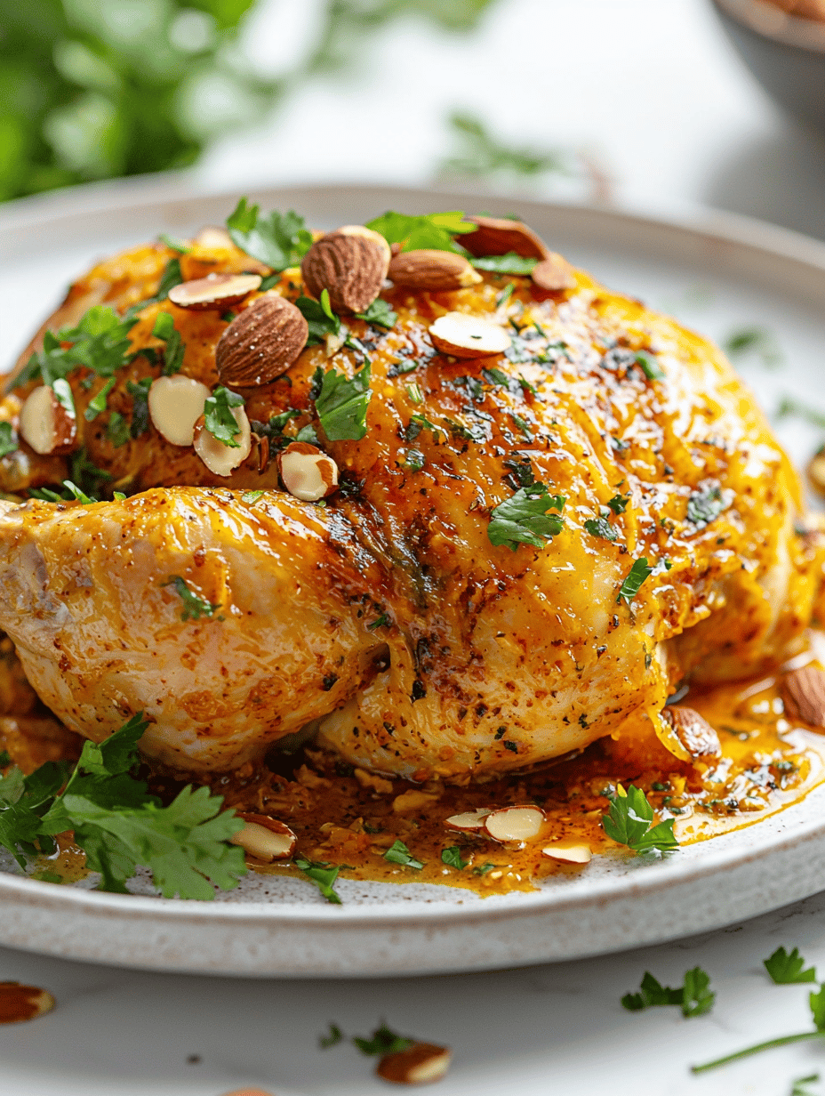 - Serve the Moroccan chicken hot, garnished with additional almonds or fresh herbs if desired.