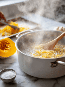 Step 2: While the pumpkin roasts, cook your pasta in boiling salted water until al dente—roughly 8-10 minutes, then drain and set aside.