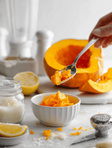 Step 1: Start by roasting a small sugar pumpkin at 200°C (400°F) for about 45 minutes until it’s tender and a little caramelized around the edges.