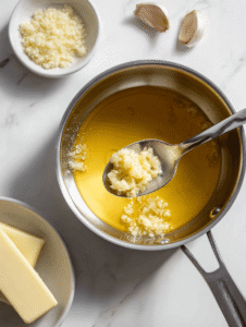 - In a saucepan over medium heat, melt the butter and add the minced garlic. Cook for about 30 seconds, until fragrant and just starting to turn golden.