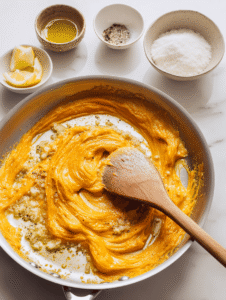 - Stir in the mashed pumpkin, allowing it to warm and meld with the garlic butter for about 2 minutes, creating a vibrant orange base.