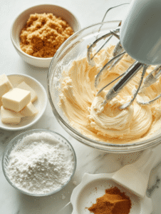 - In another bowl, beat the softened butter and brown sugar together using an electric mixer or whisk until the mixture is fluffy, light, and slightly pale—about 2-3 minutes. The sound should be a gentle whir, and the mixture will look creamy.