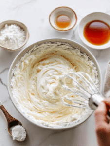 - While the cookies cool, prepare the filling by beating the softened cream cheese and powdered sugar together until smooth and creamy, about 2 minutes. The filling should be fluffy and spreadable.