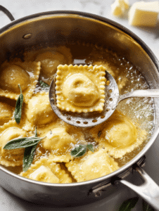 9. Transfer the cooked ravioli to the skillet with the browned sage butter. Gently toss to coat each piece, letting the edges absorb the rich, nutty flavor. Cook for another minute until heated through and fragrant.