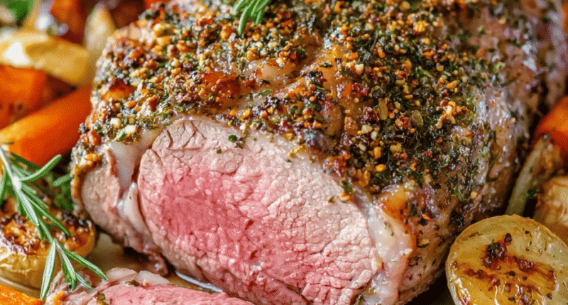 8. Slice the rested lamb into thin, tender pieces showing a rosy pink interior and a crisp, golden herb crust.