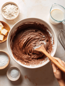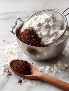 Step 3: Mix dry ingredients: flour, cocoa powder, baking powder, and salt.