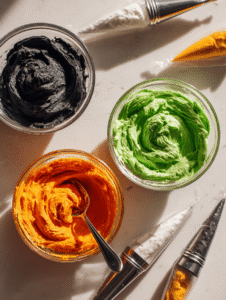 - Divide the frosting into small bowls and tint with food coloring—black, orange, and green—to add creepy accents. Fill piping bags fitted with tips for detailed decorating.