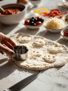 - Using a cookie cutter or sharp knife, carefully carve out spooky faces or shapes in the dough. This adds a fun, festive touch to your pizza.