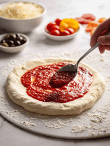 Step 3: Spread a thin layer of tomato sauce over the dough, leaving a small border.
