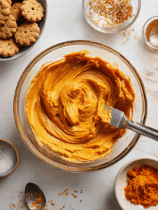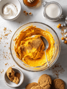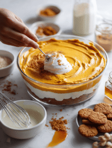 - In a mixing bowl, gently fold the spiced pumpkin pudding until smooth and creamy, ready for layering.