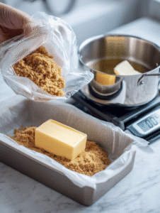 Step 3: Mix crushed graham crackers, melted butter, and a pinch of salt for the crust. Press into the pan.