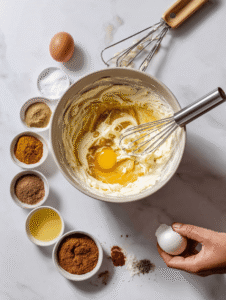 - Add eggs one at a time, mixing well after each addition. Then stir in ground cinnamon, nutmeg, ginger, vanilla, and lemon juice until fully incorporated and the mixture is silky.